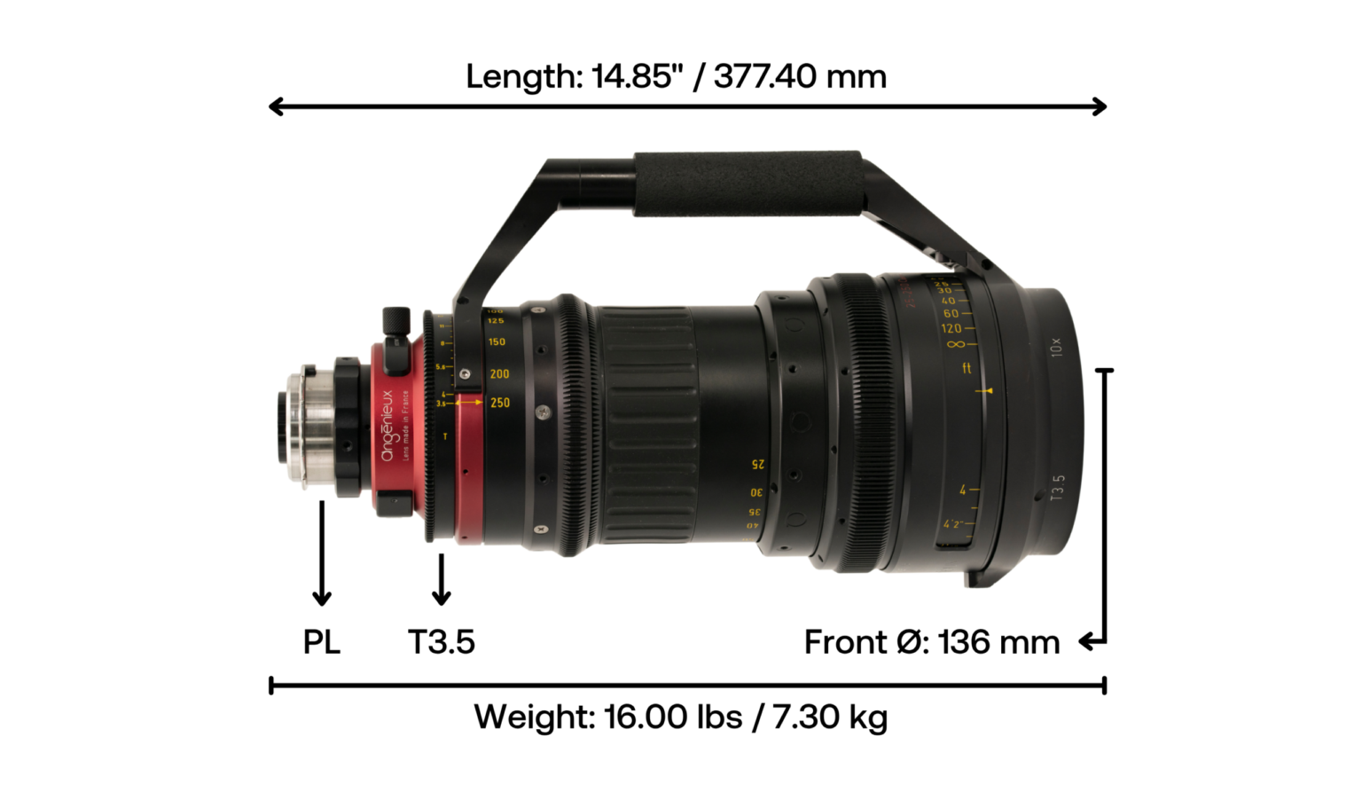 The Angénieux HR 25–250mm T3.5 has perhaps the most storied legacy of any cine zoom, spanning multiple generations and design iterations. Covering a massive 10:1 range, it allows filmmakers to capture everything from moderately wide frames to tight telephoto close-ups without switching lenses. The HR (High Resolution) version, introduced in the 1970s, was considered a marvel of engineering, while the Optimo Style 25–250mm, introduced decades later, modernized the design for contemporary cinema. Available for rental or sub-rental at Cine Visuals.