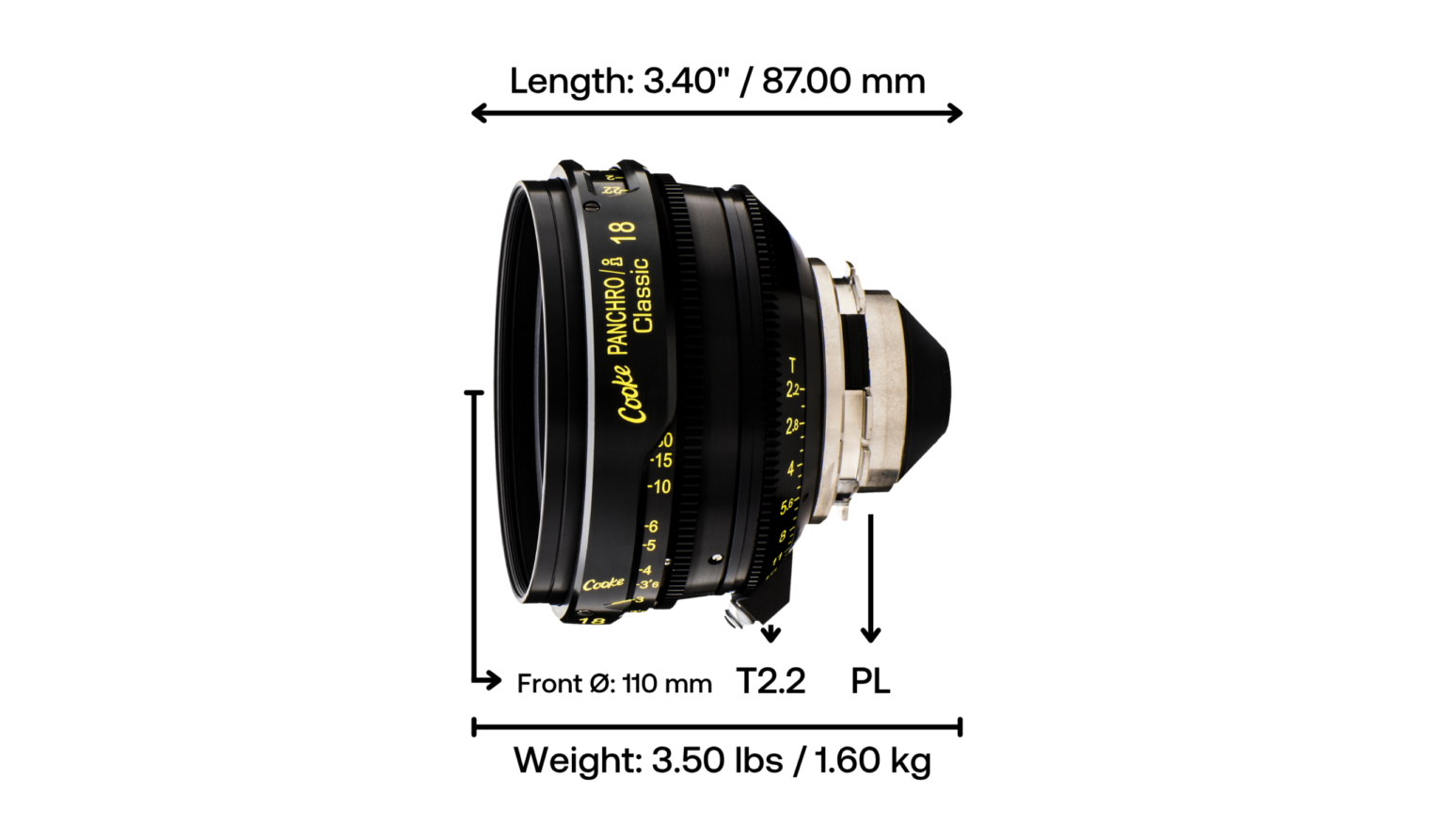 Panchro/i Classic S35 lenses are built with consistent mechanics across the set, featuring 110mm front diameters and 270ยฐ focus rotation. Weights range from 1.5 to 3.2 kg (3 to 7 lbs) depending on focal length, making them lighter and more agile than many modern cinema primes, and suitable for Steadicam, handheld, or drone applications. Each lens comes in PL mount and incorporates Cooke /i Technology for metadata transmission.