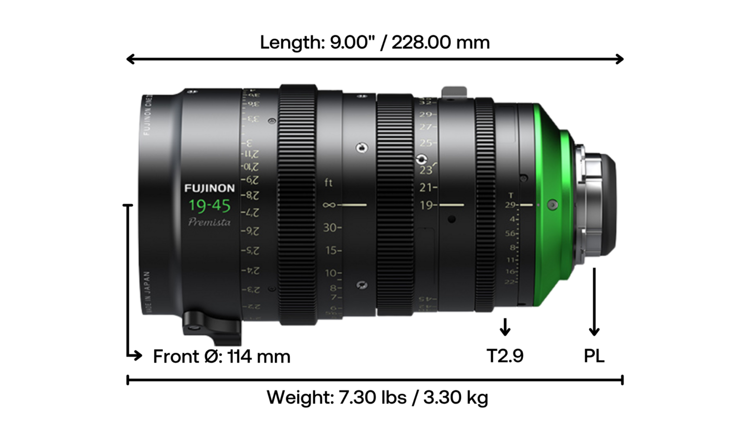 Premistas are surprisingly compact for large-format zooms. The 28โ100mm and 80โ250mm each weigh about 3.8 kg (8.4 lbs), while the 19โ45mm is slightly heavier at 3.7 kg (8.1 lbs). All three share consistent 114mm front diameters, standardized focus/iris/zoom gear positions, and robust PL mounts, making them straightforward for professional crews to handle. Focus rotation is 280ยฐ, offering precise control.