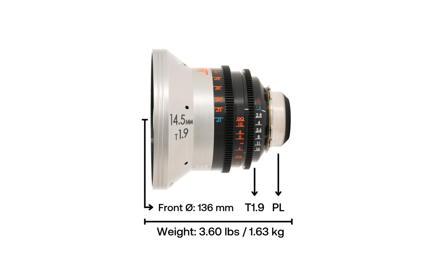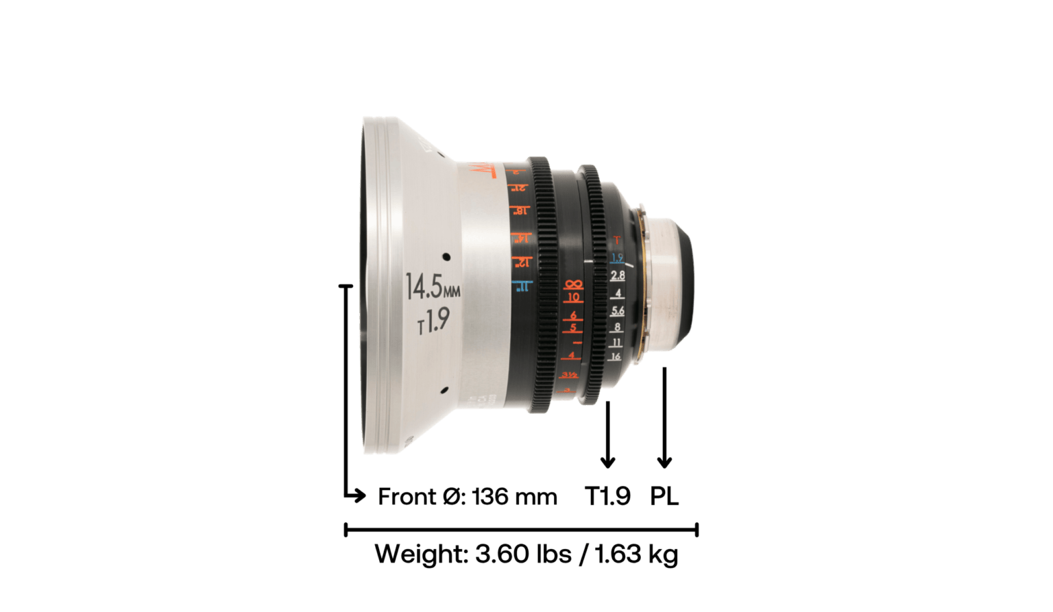 Compact compared to most ultra-wides, the lens integrates smoothly with the MasterBuilt ecosystem. It features PL mounting, a 136mm front diameter, and cine-standard mechanics, with geared focus and iris rings and robust construction. Its moderate weight, 3.6 pounds, makes it suitable for handheld and gimbal use, while its coverage ensures compatibility with large-format digital cinema cameras.