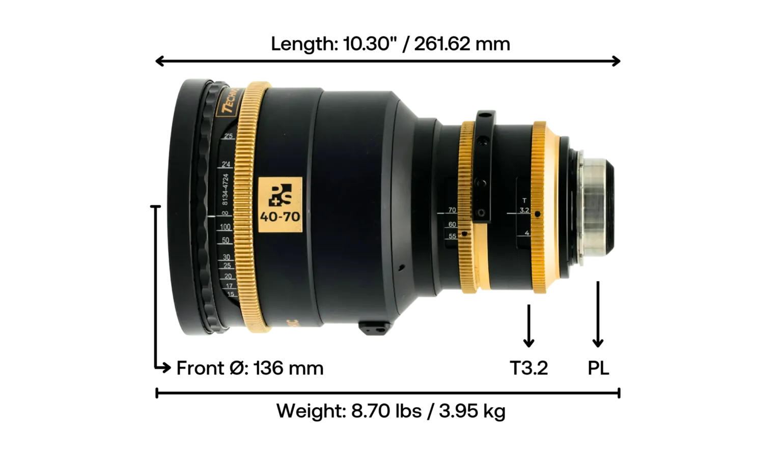 Though larger than the primes, these zooms are relatively compact for anamorphics, making them more adaptable for handheld and Steadicam setups. The 40-70mm weighs 8.8 lbs. (4kg) and the 70-200mm weighs 12.2 lbs. (5.5 kg). They feature robust housings, PL mounts, and geared controls.